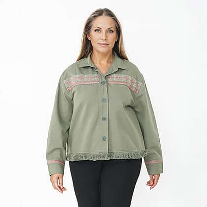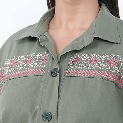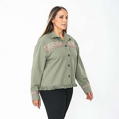 Add a touch of laid-back charm to your wardrobe with this Tamsy pure cotton embroidered jacket in green. Crafted from 100% pure cotton, it offers breathable comfort and a relaxed fit that’s perfect for layering. The sage green tone is beautifully accented with pink and beige floral embroidery across the chest, sleeves, and back. A fringe-trim hem brings a subtle boho twist, while the front button-down closure and shirt-style collar keep the look classic. With full sleeves and detailed cuffs, this jacket blends everyday ease with refined artistry—ideal for elevating casual outfits with a hint of sophistication.