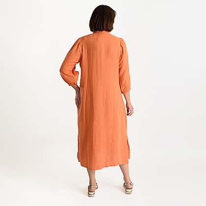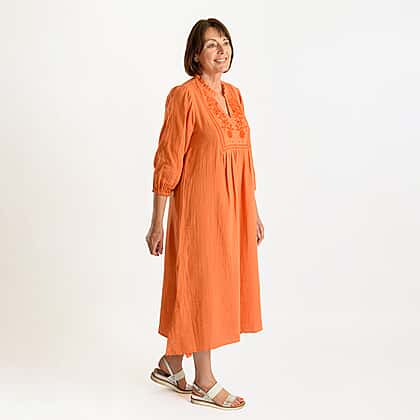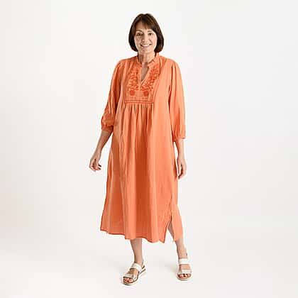 Style this simple and classic embroidered 3/4 sleeves midi dress by Tamsy. It features a v-neckline with embroidered details around the neck, 3/4 sleeves with elasticated cuffs and a soft, comfortable fabric.