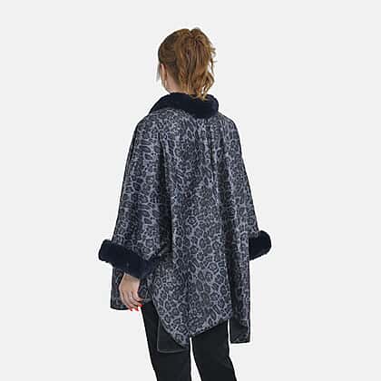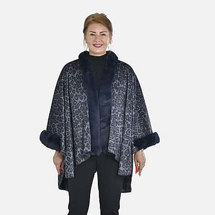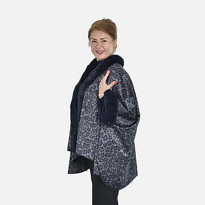 TAMSY Leopard Printed Double Layer Faux Fur Kimono - Navy