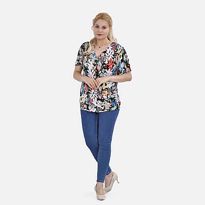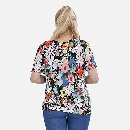 Brighten up your everyday style with the Tamsy V-neck women's top in black with a multi-floral print. The vivid floral design pops beautifully against the dark backdrop, creating a flattering and eye-catching look. Its V-neckline enhances the neckline, while the short flutter sleeves lend an airy, feminine touch. The soft elasticated hem shapes the top perfectly without feeling restrictive. Designed in a breezy, slip-on style, it’s ideal for days when comfort and colour matter most. Whether worn with trousers or denim, this floral top adds easy charm to any outfit.