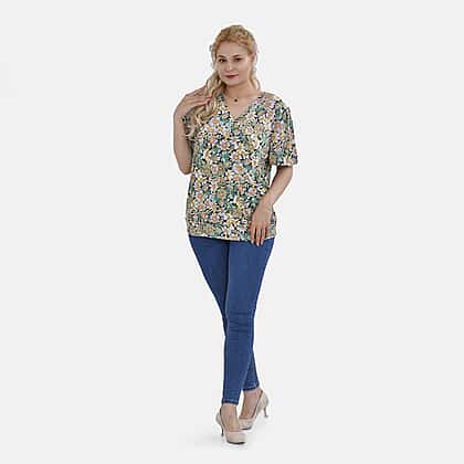 Add a pop of freshness to your wardrobe with the Tamsy V-neck women's top in green with floral detailing. The soft green tone, sprinkled with delicate blossoms, makes it a cheerful choice for casual wear. Crafted from a lightweight fabric, it feels smooth and breathable throughout the day. The V-neckline and flutter sleeves create an effortlessly relaxed silhouette, while the elasticated hem offers a comfortable fit that flatters the waist. Easy to style and even easier to wear, this slip-on top brings laid-back charm with a touch of floral grace.