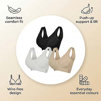 This set of three Comfortisse support push-up bras offers the perfect combination of style, support, and comfort. Designed to provide gentle lift and shaping, each bra features soft, breathable fabric that ensures all-day wearability. The set includes three versatile colours—black, nude, and white—making it an essential addition to any wardrobe. Whether for everyday use or special occasions, these bras are designed to enhance your natural silhouette with a seamless fit.