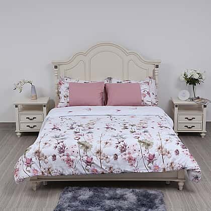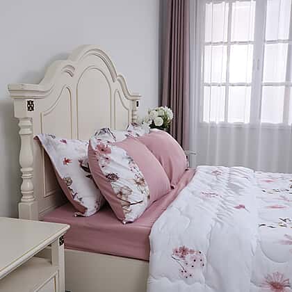 6 Piece Set - Floral Pattern Comforter Fitted Sheet 2 Pillow Case and 2 Envelope Pillow Case - White & Dusty Pink