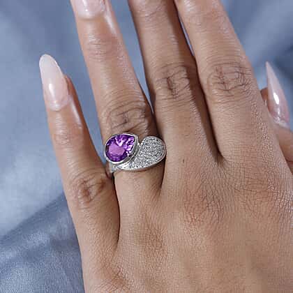 Concave Cut Zambian Amethyst & White Zircon Ring in Rhodium Overlay Sterling Silver 3.56 ct.