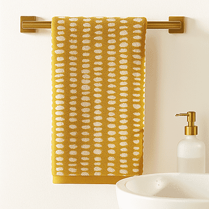Brighten up your bathroom with the Copenhagen Home 100% cotton woven abstract dot pattern jacquard hand towel in yellow. Crafted from premium 550gsm cotton, this towel combines everyday luxury with lasting quality. Its soft jacquard weave offers excellent absorbency while maintaining a plush, textured feel against the skin. The playful dotted design in a warm yellow hue brings a cheerful, modern touch to your space. Measuring 90x50cm, it’s the perfect size for hand drying or guest use, adding both style and comfort to your bathroom essentials.