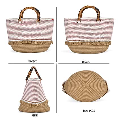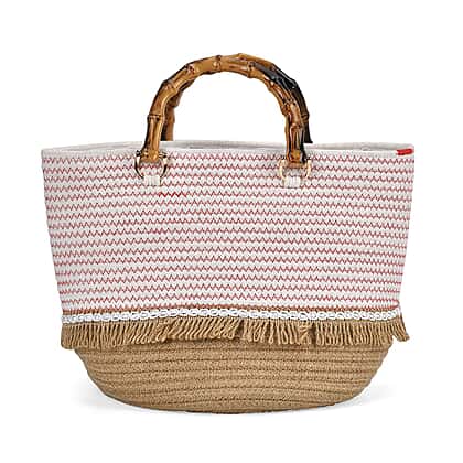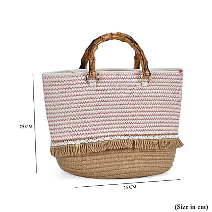 Cotton Wooven Bucket Bag with Bamboo Handle with fancy Laces - Red