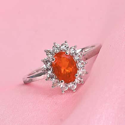 Crimson Fire Opal and Natural Cambodian Zircon Halo Ring in Platinum Overlay Sterling Silver 1.00 Ct.