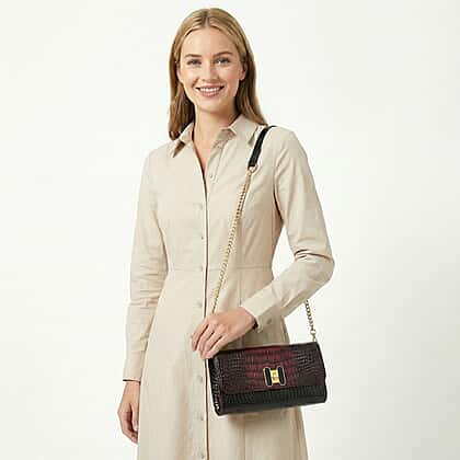 Crocodile-Embossed Pattern Two-Tone Wallet Crossbody Bag with Chain Strap - Burgundy & Black