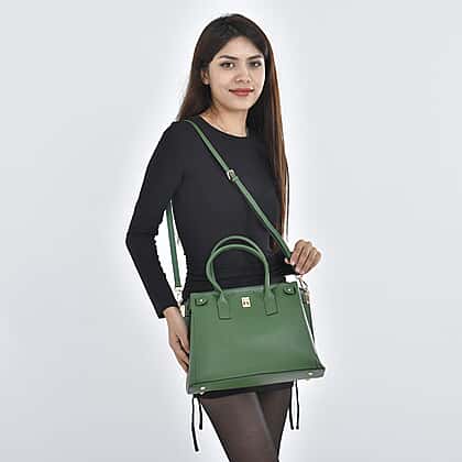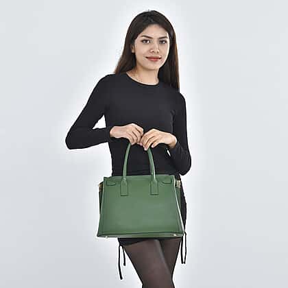 Bring home the Genuine Leather Solid Crossbody Bag with Handle Drop and Shoulder Strap. Crafted with high-quality leather, this bag is sturdy and durable. The bag is designed with a handle drop and shoulder strap, and has 2 compartments with 1 zip closure. The polyester lining of the bag provides a secure layer inside the bag. The bag comes in a stunning green colour and the size of the bag is 34x24x14 cm.