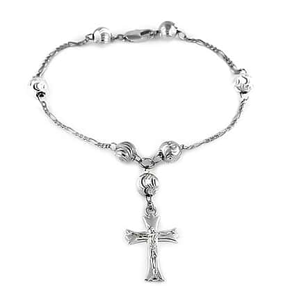 A contemporary trend of Pure white brass is used for beaded chain. The bracelet is supported by shaped beads spaced at regular intervals. The paper clip chain and bead contrast helps to balance the pattern. The cross that hangs from the bracelet's centre gives it a more beautiful appearance. The jewellery is fastened to your wrist line with an easy-to-use lobster lock.