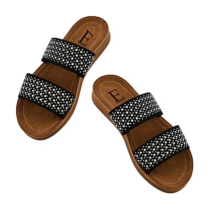 Give your feet the comfort and style it deserves with these crystal-studded ladies' sliders. The upper material is crafted from textile fabric, and the lower ankle length shaft height is made from polyester, anti-skid, and anti-slip, giving you a proper grip while you walk. These sliders have a dual strap with crystal detailing to give a sparkling touch. You can carry them with your party wear dress or beach outfits to grace the look.