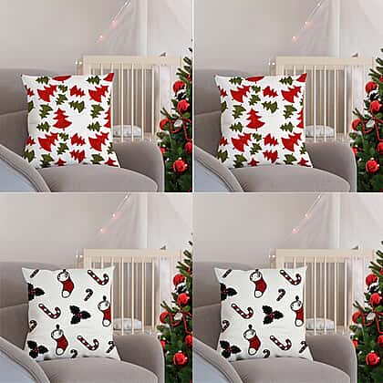 Christmas Decoration - Set of 4 Cotton (100%) Towel Embroidery Soft Cushion Cover with Christmas Tree & Stocking Pattern (45x45cm)