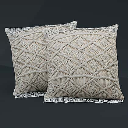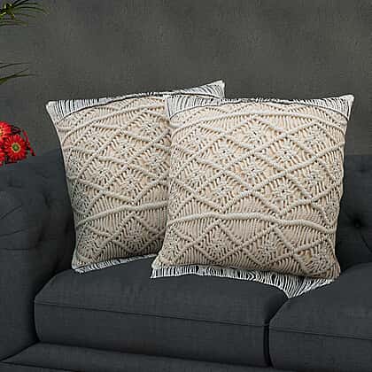 Set of 2 - Handmade 100% Cotton Macrame Cushion Cover with Zipper (Size 40 Cm) - Ivory