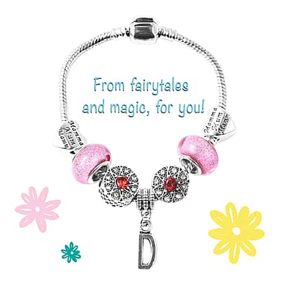 D Initial Charm Bracelet for Childrens in Simulated Pink Colour Bead, Red and White Austrian Crystal Size 6.5 Inch in Silver Tone