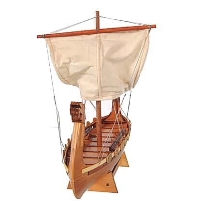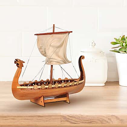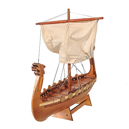 - CONTENTS: The beauty of this long boat lies in its components that makes this sea conqueror an enthralling beauty and those components are lines of shields along 2 sides of boats, many wooden oars, colourful Viking sail, brass nameplate, and stand