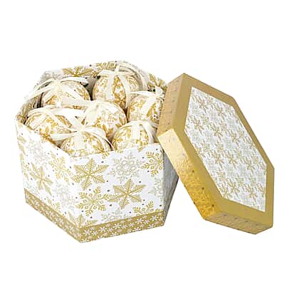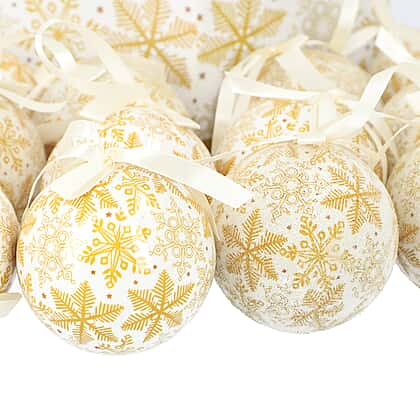 - COLOURS: The balls showcase a snowflake pattern decked with golden colour on a white backdrop, keeping the theme subtle and elegant