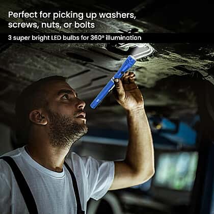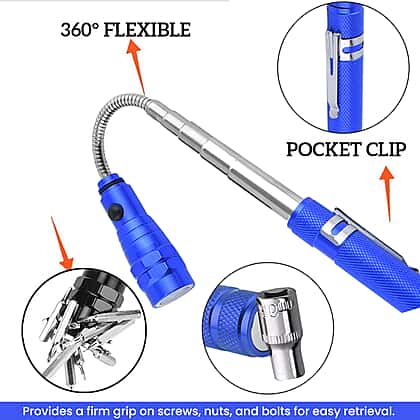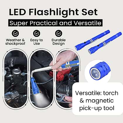 Enlighten your path and surroundings, wherever you go with this set of two magnetic flashlights. An extensible stem, flexible neck, magnetic head, and base are included in this set of two LED torches. They're great for picking up washers, screws, nuts, and bolts since they have magnetic ends. The three extra brilliant LED bulbs with 360-degree illumination deliver more light than regular flashlights. They're made of weather- and shock-resistant military-grade aluminium alloy. These 17x2.2cm LED four LR44 button batteries power torches.