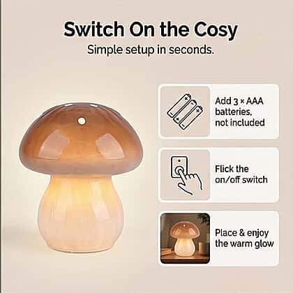 Bring soft, inviting light to your home with this Livmore Glass Mushroom LED Lamp in Brown. Designed with a smooth, spray-painted glass body, this whimsical piece doubles as décor and ambient lighting. The warm glow from its 10-LED string makes it perfect for bedrooms, living spaces, or reading nooks. Measuring 13.5 x 13.5 x 15.5 cm, it’s easy to place anywhere you need a comforting touch. Simply insert three AAA batteries (not included) and flick the on/off switch to enjoy instant cosiness. A charming accent that complements any modern or rustic interior.