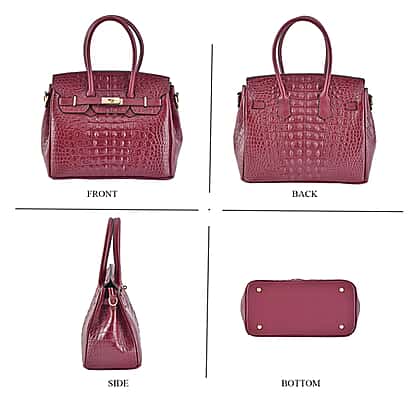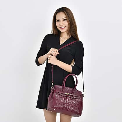 Designer Closeout Deal - Luxury Crocodile Embossed Genuine Leather Handbag with Detachable Long Strap - Ox Blood