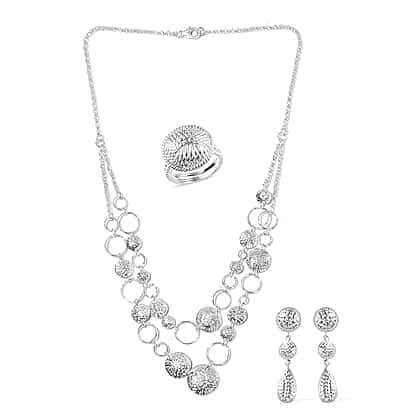 3 Pcs Set Cocktail Ring Drop Earring with Statement Necklace in Silver 18 Inch