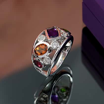 Infused with vibrant joy and unapologetic style, this designer-inspired African amethyst cluster ring by D’joy makes a bold statement. Handcrafted in hypoallergenic, tarnish-resistant platinum overlay sterling silver, its domed band is set with a striking African amethyst at the centre, surrounded by robust garnet, citrine, chrome diopside, and white zircon—each offering a splash of vivid colour and sparkle. The high-polish bezel setting and wide openwork gallery lend a contemporary, high-end feel. Designed for those who desire self-expression and individuality through luxury, this piece feels rare, personal, and joyfully wearable—perfect for brightening both everyday looks and special occasions.