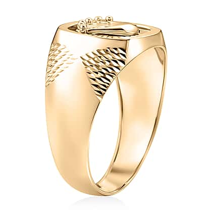 Make a bold statement with this designer inspired 9K yellow gold crown ring, crafted to showcase strength and refined detailing. The signet style face features a raised crown emblem framed within a textured circular border, creating a strong and structured focal point. Intricate side detailing adds depth and character, enhancing its sculpted profile. The solid band tapers smoothly for a comfortable and balanced fit. Finished in polished yellow gold, this ring delivers confident style with a heritage inspired edge. A perfect piece for special occasions and gifting for a lasting impression.