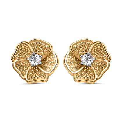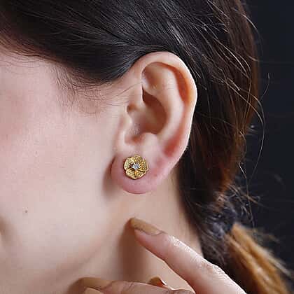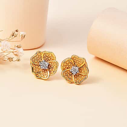 Add a touch of elegance to your look with these Designer Inspired Diamond Stud Earrings. Featuring a charming floral design, each earring features a white diamond at the centre. Crafted out of durable brass, the earrings are plated with lustrous yellow gold. With a delicate and feminine design, the earrings are a dazzling addition to any jewellery collection.