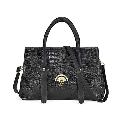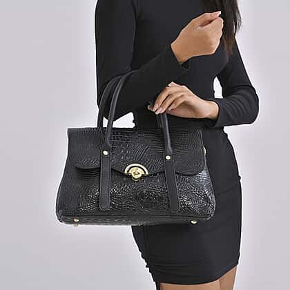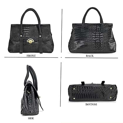 Designer Inspired- Elegant Croc-Embossed Satchel Handbag - Black