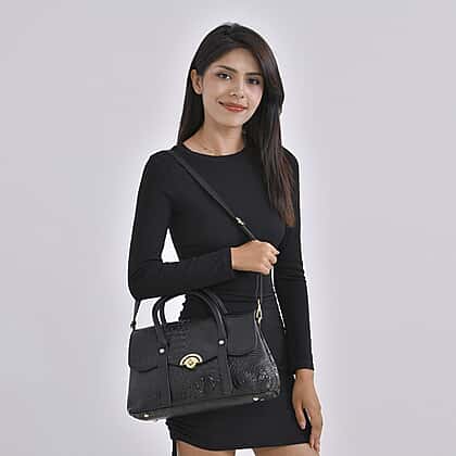 Effortlessly chic and beautifully structured, the designer-inspired croc-embossed satchel handbag in black is your go-to for polished everyday style. Crafted from premium leatherette, it features a bold croc-embossed texture that adds a touch of luxury to any outfit. Designed with two sturdy handles and a detachable long strap, it offers versatile carry options to suit your day. The twist-lock closure and multiple zippered compartments keep your essentials secure and organised, while bottom studs protect the base from wear. Perfect for work, shopping, or evenings out, it’s a modern classic you’ll reach for again and again.