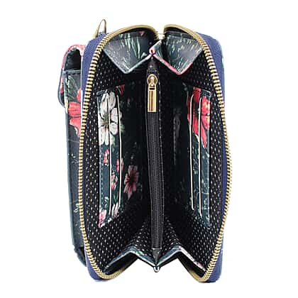 Designer Inspired- Floral Pattern Crossbody Phone Handbag with Shoulder Strap - Navy