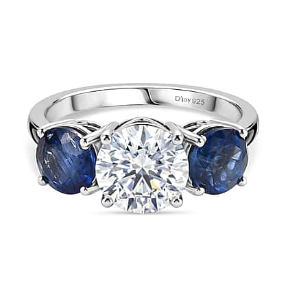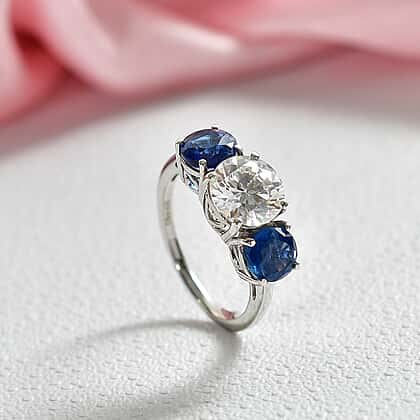 Designer Inspired- Natural Kyanite and Moissanite 3 Stone Ring in Rhodium Overlay Sterling Silver 4.03 Ct.