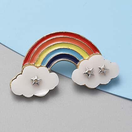 Designer Inspired- Rainbow Enamelled Brooch with Cloud in Yellow Gold Tone.