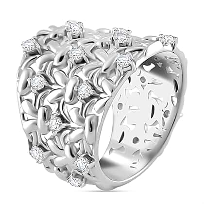 - 20 Moissanites Rounds bring a feverish sparkle to the ring designed in Sterling Silver