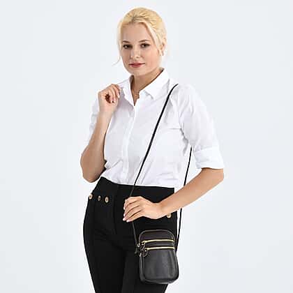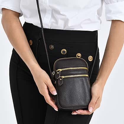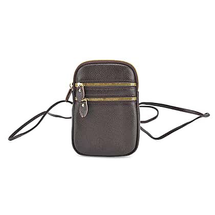 This designer inspired genuine leather crossbody bag offers a compact accessory designed for carrying everyday essentials with ease. Crafted from genuine leather, the bag features a textured dark brown finish that gives it a refined and contemporary appearance. The compact structure provides space for small items such as a phone, cards, or keys while remaining lightweight and easy to carry. A secure zip closure helps keep belongings organised and protected. The adjustable crossbody strap allows comfortable hands-free wear throughout the day. Combining practical storage with a rich brown tone, this leather crossbody bag offers a stylish and convenient everyday accessory.
