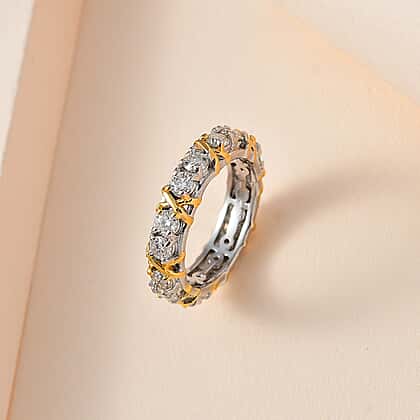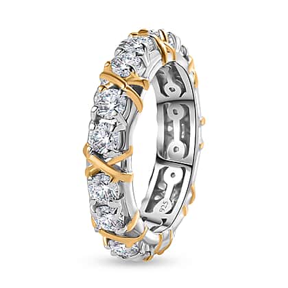 Crafted to captivate, this designer-inspired moissanite criss cross ring intertwines luxury with innovative design. The band glistens with rounds of moissanite, punctuated by an 'X' design after every two rounds, artistically draped in 18K yellow gold vermeil. This ring is a statement of elegance with its seamless blend of platinum-plated sterling silver and golden hues, making it a stunning addition to any collection.