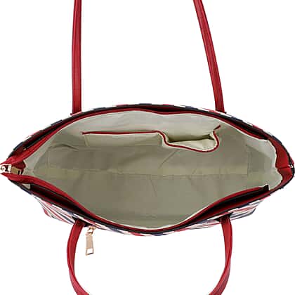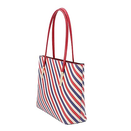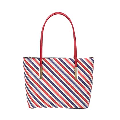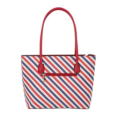 Diagonal Stripe Pattern Tote Bag with Zipper Closure and External Pocket (Size 32x11x26 Cm) - Red, Navy and Multi