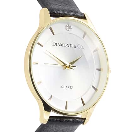 DIAMOND And CO LONDON Diamond Studded Watch with Black Leather Strap in Gold Tone