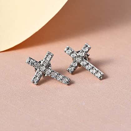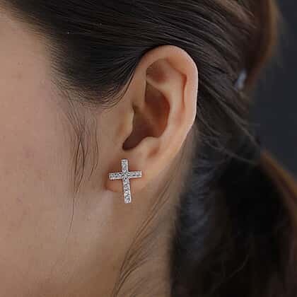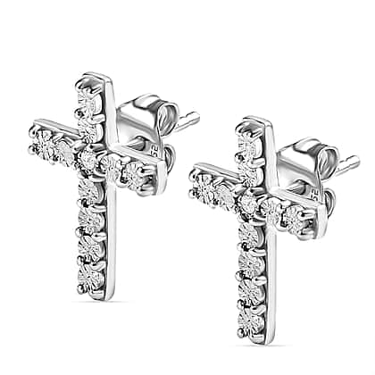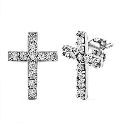 Diamond Cross Earrings (with Push Back) in Platinum Overlay Sterling Silver 0.016 Ct.