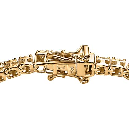This Diamond Tennis Bracelet in 18K Yellow Gold Vermeil over silver is a radiant creation where the eye-catching glimmer of diamonds meets the luminous warmth of yellow gold. This exquisite composition rubs off on you with its sunny vibe that brightens even the dullest of days. The tennis bracelet has diamonds perched on independent prongs to create a station design that is completed by an open-box clasp.