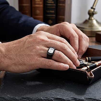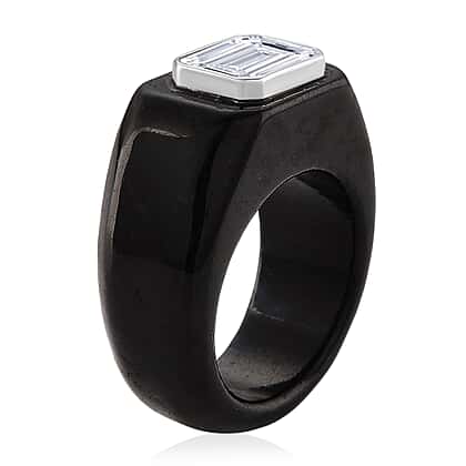 D'Joy - Moissanite & Dyed Black Jade Solitaire Band in Rhodium Overlay Sterling Silver 30.87 Ct.