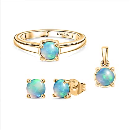 Unveil the realm of luminous beauty with this 3-piece Ethiopian opal jewellery set, where each piece is a perfect fusion of colour and charm. The set features a pair of earrings, a ring, and a pendant, all with an Ethiopian opal gemstone, known for its unique colour. The gemstone showcases an enchanting play of colour, like green, blue, and gold, that is complemented by 18K yellow gold plating. It is meticulously crafted in hypoallergenic 925 sterling silver, ensuring high quality and comfort, even for sensitive skin. This artisanal mastery and enduring beauty will add extraordinary drama to your collection.