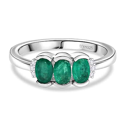 D'Joy AAA Gemfields Zambian Emerald & Lab Grown Diamond Trilogy Ring in Rhodium Overlay Sterling Silver