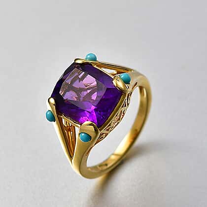 D'Joy African Amethyst & Sleeping Beauty Turquoise Cushion-Cut Solitaire Ring in Yellow Gold Plated Sterling Silver 5.51 Ct.