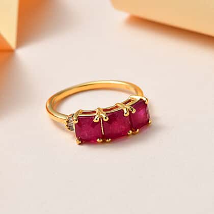 D'Joy African Ruby Asscher Cut & White Diamond Trilogy Ring in 18K Vermeil Yellow Gold Plated Sterling Silver 2.62 Ct.