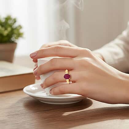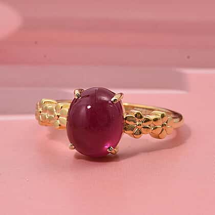 When it comes to choosing the most beautiful jewellery for your beloved, nothing beats the charm of red ruby. This romantic gemstone is associated with love and passion, hence making for a deeply sentimental choice. This D'Joy African ruby raspberry-red cabochon sits proudly at the center, its smooth surface catching soft light with a natural glow. Crafted in yellow gold plated sterling silver, the band features a delicate floral-inspired pattern that helps add elegance and a touch of femininity to the design.