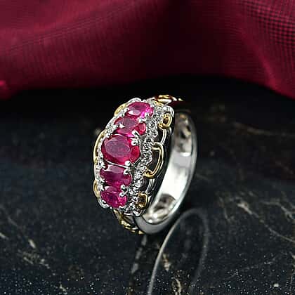 D'Joy Natural African Ruby, White Zircon 5 Stone Ring in Platinum and Yellow Gold Plated Sterling Silver 2.23 Ct.