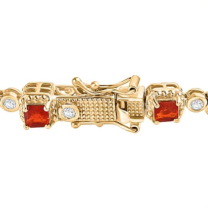 D'Joy Asscher Cut Salamanca Fire Opal & Natural Zircon Tennis Bracelet (Size 7) with GB Lock Box in 18K Vermeil Yellow Gold Plated Sterling Silver 5.07 Ct, Silver Wt. 13.78 Gms.