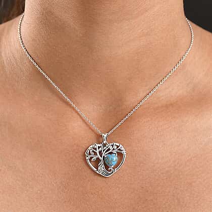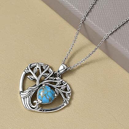D'Joy Blue Mojave Turquoise Tree of Life Heart Pendant with Cable Chain (Size 20) in Black Oxidised Sterling Silver 1.78 Ct.