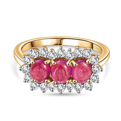 Steal the spotlight with this stunning ring from D'joy, featuring a trio of cabochon ruby gemstones lying at the centre of the piece. A halo of dazzling white zircons surrounding the Cabo Delgado ruby enhances its beauty, creating a piece that captures attention. Crafted in hypoallergenic 925 sterling, this ring ensures durability and comfort for sensitive skin. The lustrous yellow gold plating on sterling silver ensures enduring shine and is contrasted with the red hue of the ruby, drawing attention. Experience the beauty of red ruby with this striking piece that captivates both heart and eyes.