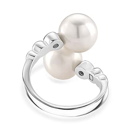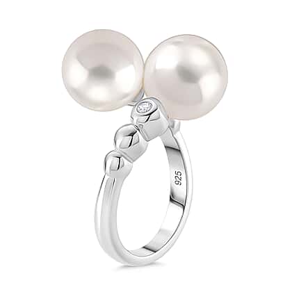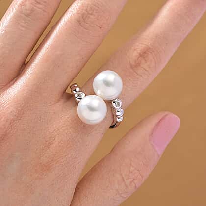 This standout design pairs two lustrous Edison pearls in a modern open-ring design, creating a soft yet striking statement on the hand. The pearls are beautifully complemented by white zircon accents on each shoulder, introducing a gentle sparkle that enhances their smooth sheen. Crafted in rhodium overlay on 925 sterling silver, the ring offers a sleek finish with lasting shine while maintaining a graceful and feminine presence. Classy yet hypoallergenic, the ring comforts sensitive skin, and its design remains gentle on the fingers.